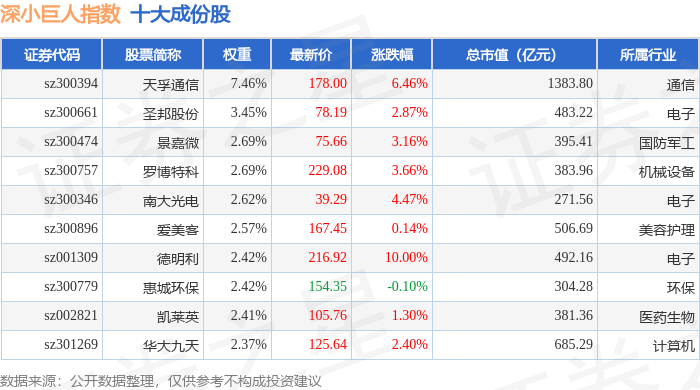 深小巨人(399268)指数十大成份股详情如下: