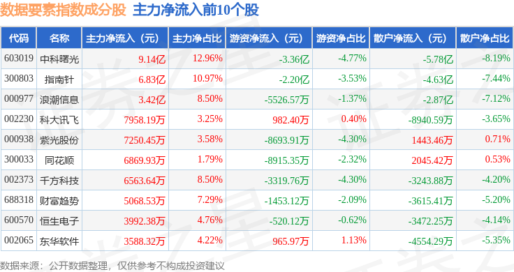 资金流向方面,数据要素(399418)指数成份股当日主力资金净流入合计8.41亿元,游资资金净流出合计4.73亿元,散户资金净流出合计3.68亿元。成份股资金流向详情见下表: