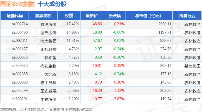 国证农牧(399435)指数十大成份股详情如下: