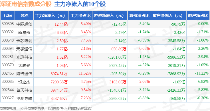 资金流向方面,深证电信(399621)指数成份股当日主力资金净流入合计27.05亿元,游资资金净流出合计19.01亿元,散户资金净流出合计8.04亿元。成份股资金流向详情见下表: