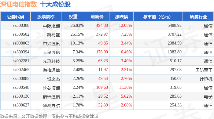 证券之星消息,10月24日,深证电信(399621)指数报收于11006.8点,涨7.15%,成交794.95亿元,换手率4.22%。当日该指数成份股中,上涨的有21家,中际旭创以12.05%的涨幅领涨,下跌的有2家,海能达以2.15%的跌幅领跌。