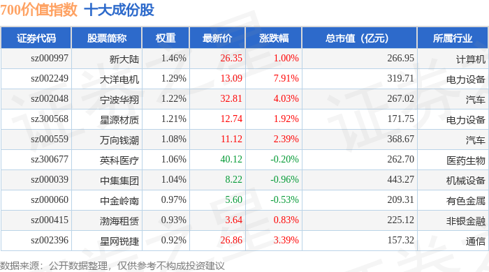 证券之星消息,10月24日,700价值(399629)指数报收于2869.13点,涨0.18%,成交552.37亿元,换手率2.07%。当日该指数成份股中,上涨的有94家,大洋电机以7.91%的涨幅领涨,下跌的有133家,深粮控股以6.42%的跌幅领跌。