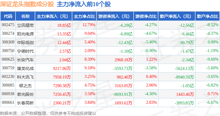 资金流向方面,深证龙头(399653)指数成份股当日主力资金净流入合计31.21亿元,游资资金净流出合计23.59亿元,散户资金净流出合计7.62亿元。成份股资金流向详情见下表: