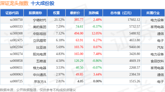 证券之星消息,10月24日,深证龙头(399653)指数报收于3073.0点,涨2.18%,成交1252.28亿元,换手率1.23%。当日该指数成份股中,上涨的有19家,中际旭创以12.05%的涨幅领涨,下跌的有30家,深粮控股以6.42%的跌幅领跌。