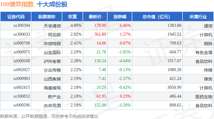 100绩效(399656)指数十大成份股详情如下: