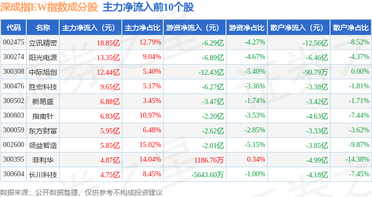 资金流向方面,深成指EW(399659)指数成份股当日主力资金净流入合计126.3亿元,游资资金净流出合计61.32亿元,散户资金净流出合计64.98亿元。成份股资金流向详情见下表:
