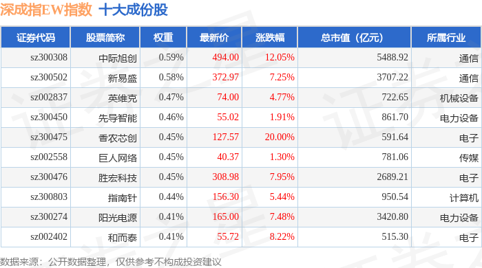 证券之星消息,10月24日,深成指EW(399659)指数报收于4567.36点,涨1.6%,成交5656.71亿元,换手率1.77%。当日该指数成份股中,上涨的有311家,香农芯创以20.0%的涨幅领涨,下跌的有181家,新诺威以7.69%的跌幅领跌。