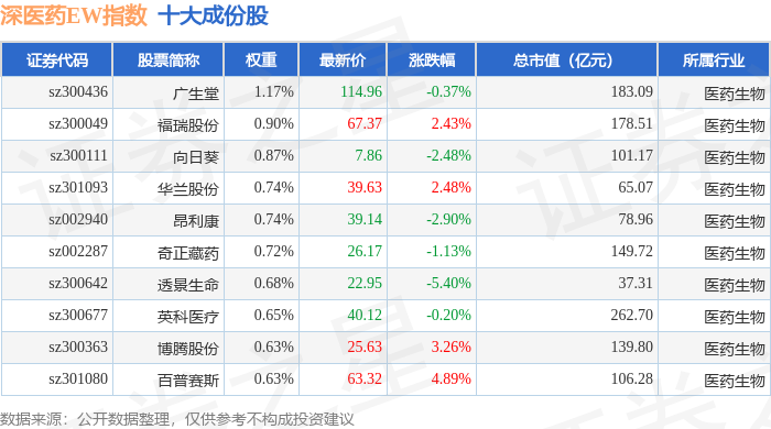 证券之星消息,10月24日,深医药EW(399676)指数报收于3831.5点,跌0.17%,成交425.06亿元,换手率1.91%。当日该指数成份股中,上涨的有93家,百普赛斯以4.89%的涨幅领涨,下跌的有120家,力生制药以6.09%的跌幅领跌。