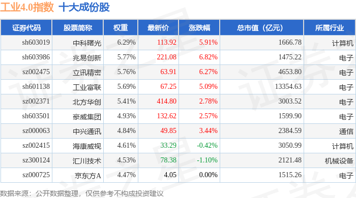 证券之星消息,10月24日,工业4.0(399803)指数报收于5495.93点,涨3.06%,成交1077.28亿元,换手率1.81%。当日该指数成份股中,上涨的有69家,汇顶科技以10.0%的涨幅领涨,下跌的有8家,汇川技术以1.1%的跌幅领跌。