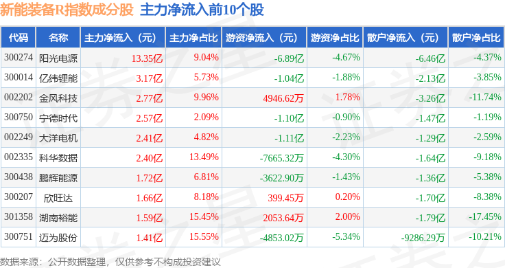 资金流向方面,新能装备R(470043)指数成份股当日主力资金净流入合计38.8亿元,游资资金净流出合计10.32亿元,散户资金净流出合计28.48亿元。成份股资金流向详情见下表: