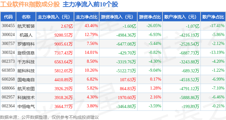 资金流向方面,工业软件R(480034)指数成份股当日主力资金净流出合计3970.49万元,游资资金净流出合计5164.2万元,散户资金净流入合计9134.68万元。成份股资金流向详情见下表: