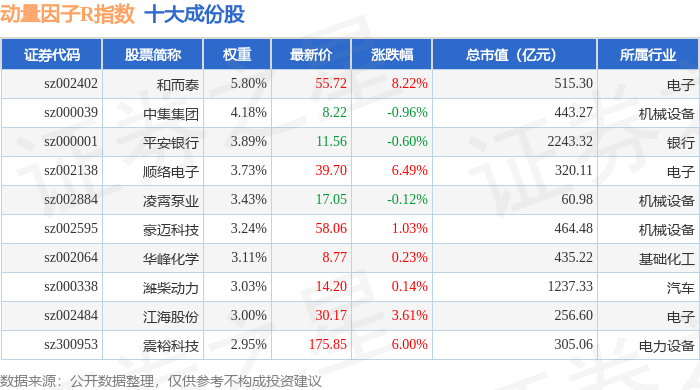 证券之星消息,10月24日,动量因子R(480057)指数报收于2816.98点,涨2.18%,成交486.96亿元,换手率2.06%。当日该指数成份股中,上涨的有36家,和而泰以8.22%的涨幅领涨,下跌的有14家,爱施德以2.59%的跌幅领跌。