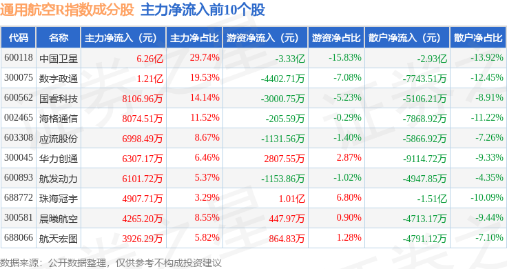 资金流向方面,通用航空R(480076)指数成份股当日主力资金净流入合计11.61亿元,游资资金净流出合计2.0亿元,散户资金净流出合计9.61亿元。成份股资金流向详情见下表: