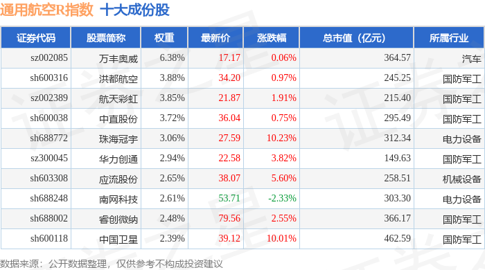 证券之星消息,10月24日,通用航空R(480076)指数报收于3552.57点,涨2.04%,成交249.29亿元,换手率2.43%。当日该指数成份股中,上涨的有44家,珠海冠宇以10.23%的涨幅领涨,下跌的有5家,深城交以4.53%的跌幅领跌。