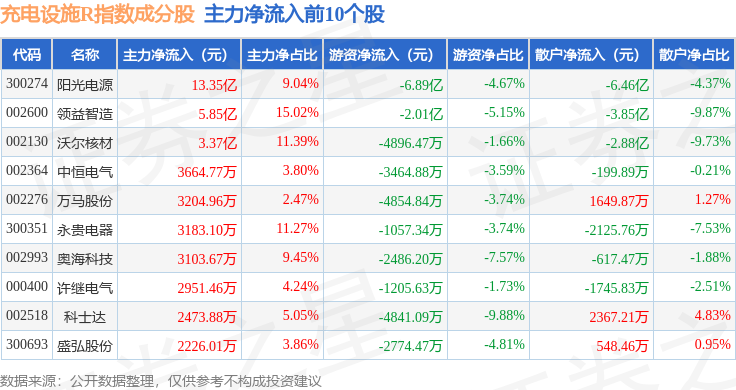 资金流向方面,充电设施R(480077)指数成份股当日主力资金净流入合计21.36亿元,游资资金净流出合计9.6亿元,散户资金净流出合计11.76亿元。成份股资金流向详情见下表: