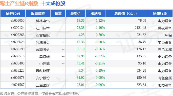 稀土产业链R(489013)指数十大成份股详情如下: