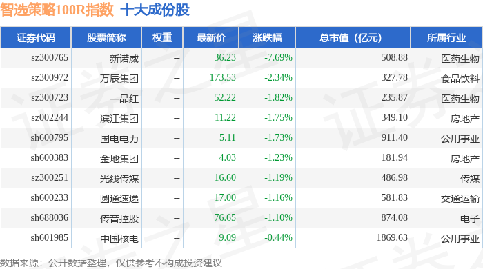 证券之星消息,10月24日,智选策略100R(489015)指数报收于4895.01点,涨3.18%,成交2194.89亿元,换手率1.95%。当日该指数成份股中,上涨的有88家,生益电子以19.99%的涨幅领涨,下跌的有11家,新诺威以7.69%的跌幅领跌。