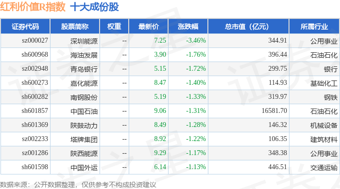 证券之星消息,10月24日,红利价值R(489016)指数报收于7636.99点,跌0.52%,成交301.82亿元,换手率0.32%。当日该指数成份股中,上涨的有15家,华域汽车以1.07%的涨幅领涨,下跌的有33家,深圳能源以3.46%的跌幅领跌。
