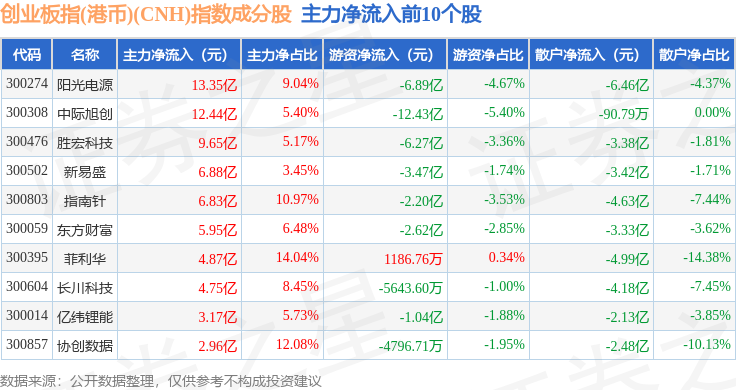 资金流向方面,创业板指(港币)(CNH)(970006)指数成份股当日主力资金净流入合计85.67亿元,游资资金净流出合计35.95亿元,散户资金净流出合计49.72亿元。成份股资金流向详情见下表: