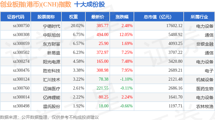 创业板指(港币)(CNH)(970006)指数十大成份股详情如下:
