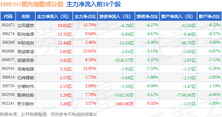 资金流向方面,100ESG领先(970030)指数成份股当日主力资金净流入合计46.07亿元,游资资金净流出合计29.36亿元,散户资金净流出合计16.71亿元。成份股资金流向详情见下表: