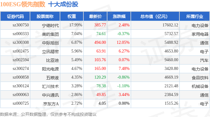 证券之星消息,10月24日,100ESG领先(970030)指数报收于6657.65点,涨2.45%,成交1510.69亿元,换手率1.2%。当日该指数成份股中,上涨的有30家,中际旭创以12.05%的涨幅领涨,下跌的有19家,招商蛇口以2.56%的跌幅领跌。