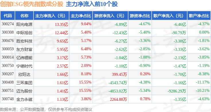 资金流向方面,创指ESG领先(970031)指数成份股当日主力资金净流入合计46.5亿元,游资资金净流出合计26.67亿元,散户资金净流出合计19.83亿元。成份股资金流向详情见下表: