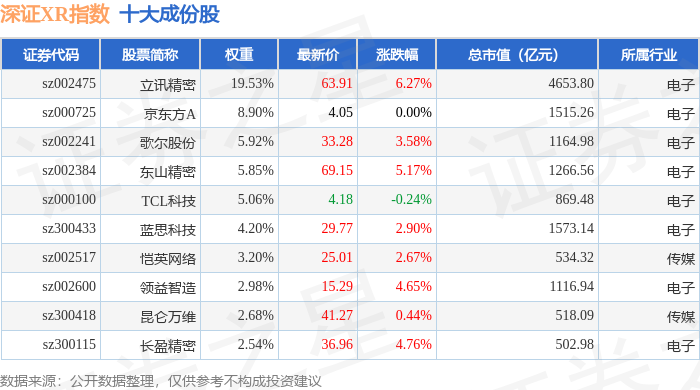 证券之星消息,10月24日,深证XR(970046)指数报收于2254.86点,涨2.79%,成交602.33亿元,换手率2.08%。当日该指数成份股中,上涨的有40家,立讯精密以6.27%的涨幅领涨,下跌的有9家,中文在线以2.86%的跌幅领跌。