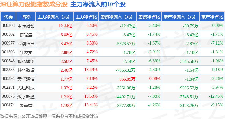 资金流向方面,深证算力设施(970051)指数成份股当日主力资金净流入合计22.64亿元,游资资金净流出合计20.95亿元,散户资金净流出合计1.7亿元。成份股资金流向详情见下表:
