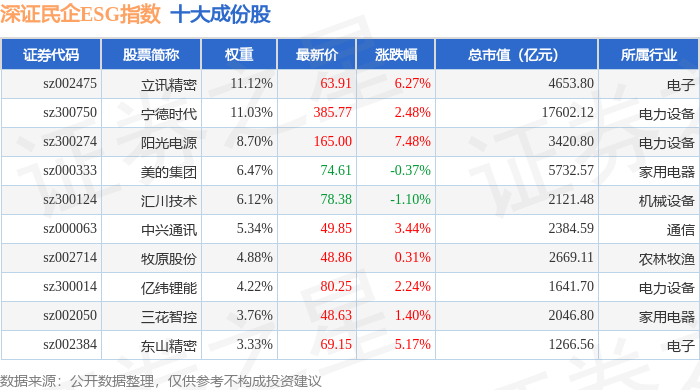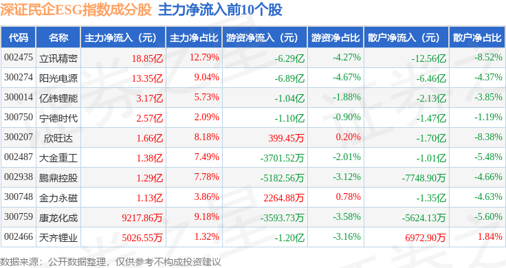 资金流向方面,深证民企ESG(970056)指数成份股当日主力资金净流入合计34.71亿元,游资资金净流出合计11.18亿元,散户资金净流出合计23.53亿元。成份股资金流向详情见下表: