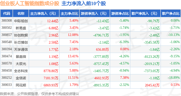 资金流向方面,创业板人工智能(970070)指数成份股当日主力资金净流入合计23.82亿元,游资资金净流出合计18.58亿元,散户资金净流出合计5.24亿元。成份股资金流向详情见下表: