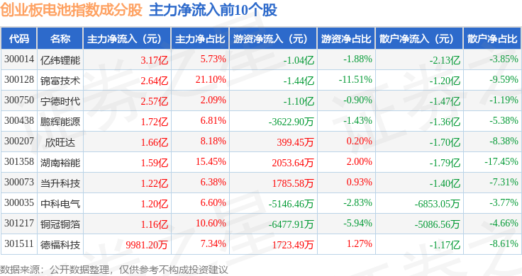 资金流向方面,创业板电池(970081)指数成份股当日主力资金净流入合计17.69亿元,游资资金净流出合计2.45亿元,散户资金净流出合计15.24亿元。成份股资金流向详情见下表: