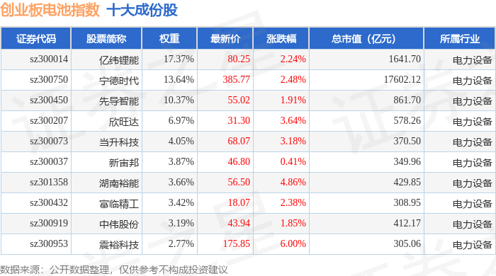 创业板电池(970081)指数十大成份股详情如下: