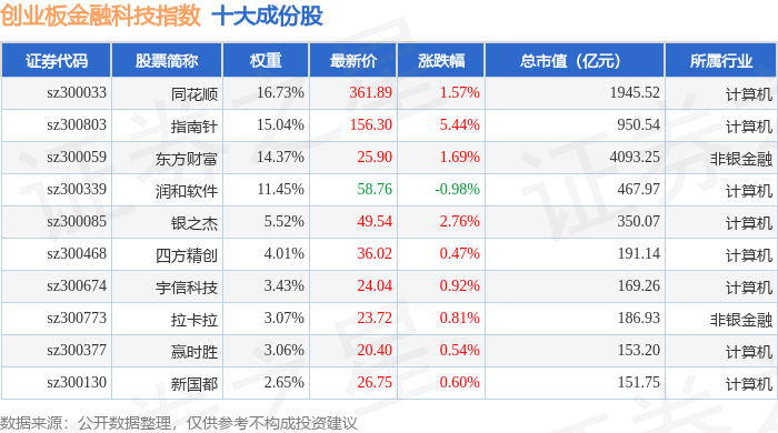 证券之星消息,10月24日,创业板金融科技(970085)指数报收于3253.27点,涨1.47%,成交311.5亿元,换手率3.04%。当日该指数成份股中,上涨的有29家,指南针以5.44%的涨幅领涨,下跌的有11家,拓尔思以2.71%的跌幅领跌。
