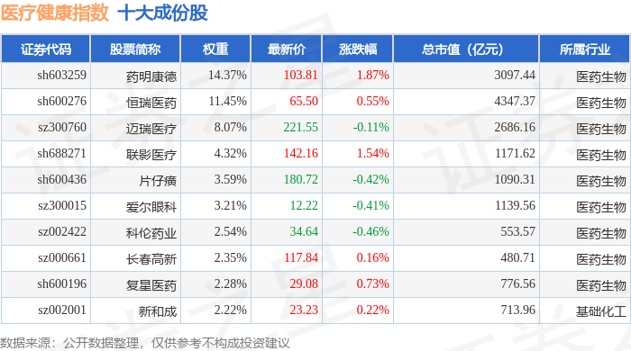 资金流向方面,医疗健康(980016)指数成份股当日主力资金净流出合计8018.6万元,游资资金净流入合计1933.09万元,散户资金净流入合计6085.52万元。成份股资金流向详情见下表: