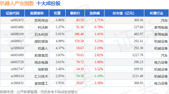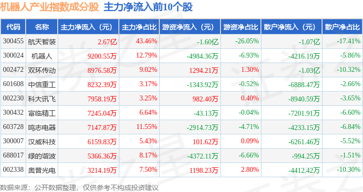 资金流向方面,机器人产业(980022)指数成份股当日主力资金净流入合计6.69亿元,游资资金净流出合计1.75亿元,散户资金净流出合计4.93亿元。成份股资金流向详情见下表: