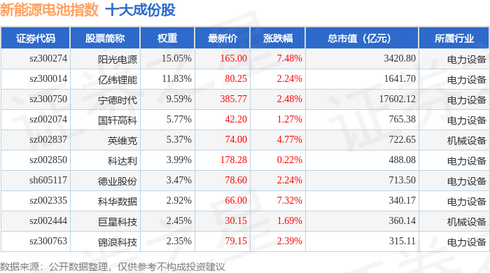 证券之星消息,10月24日,新能源电池(980027)指数报收于3354.54点,涨3.33%,成交618.91亿元,换手率2.3%。当日该指数成份股中,上涨的有39家,鹏辉能源以12.19%的涨幅领涨,下跌的有11家,华自科技以3.68%的跌幅领跌。