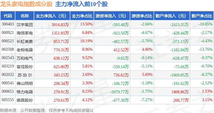 资金流向方面,龙头家电(980028)指数成份股当日主力资金净流出合计3.93亿元,游资资金净流出合计616.41万元,散户资金净流入合计3.99亿元。成份股资金流向详情见下表: