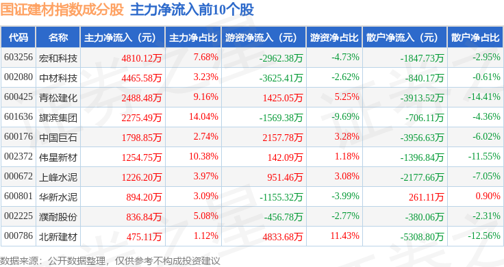 资金流向方面,国证建材(980048)指数成份股当日主力资金净流入合计7284.97万元,游资资金净流入合计8683.41万元,散户资金净流出合计1.6亿元。成份股资金流向详情见下表: