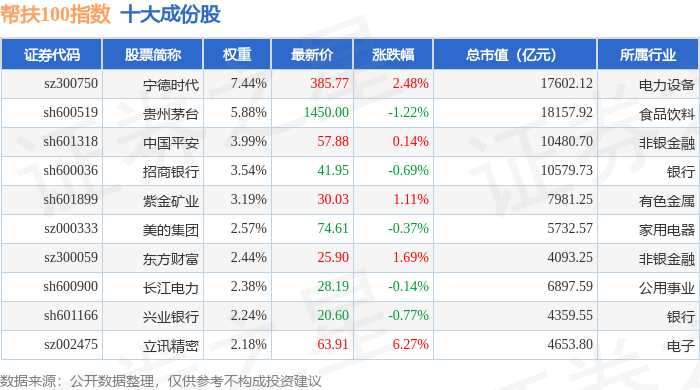 证券之星消息,10月24日,帮扶100(980065)指数报收于2175.49点,涨0.51%,成交2445.71亿元,换手率0.43%。当日该指数成份股中,上涨的有42家,阳光电源以7.48%的涨幅领涨,下跌的有55家,泸州老窖以4.64%的跌幅领跌。