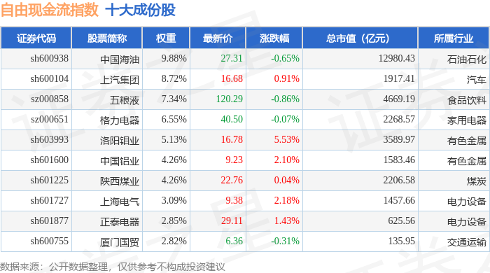 证券之星消息,10月24日,自由现金流(980092)指数报收于5192.89点,涨0.43%,成交595.15亿元,换手率1.9%。当日该指数成份股中,上涨的有46家,大洋电机以7.91%的涨幅领涨,下跌的有53家,辽宁能源以9.51%的跌幅领跌。