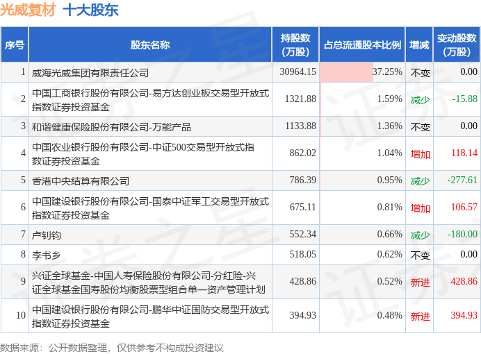 证券之星消息,10月24日光威复材发布公告《光威复材:关于控股股东减持股份触及1%整数倍的公告》,其股东威海光威集团有限责任公司于2025年10月23日合计减持237.12万股,占公司目前总股本的0.2852%,变动期间该股股价上涨1.0%,截止10月23日收盘报28.4元。