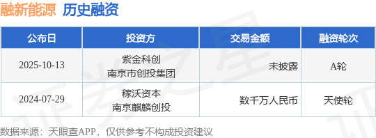 证券之星消息,根据天眼查APP于10月13日公布的信息整理,融新(南京)能源科技有限公司A轮融资,融资额未披露,参与投资的机构包括紫金科创,南京市创投集团。