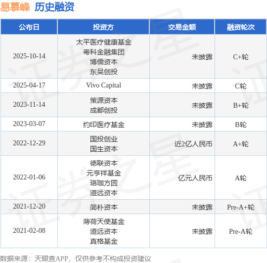 证券之星消息,根据天眼查APP于10月14日公布的信息整理,苏州易慕峰生物科技有限公司C+轮融资,融资额未披露,参与投资的机构包括太平医疗健康基金,粤科金融集团,博儒资本,东吴创投。