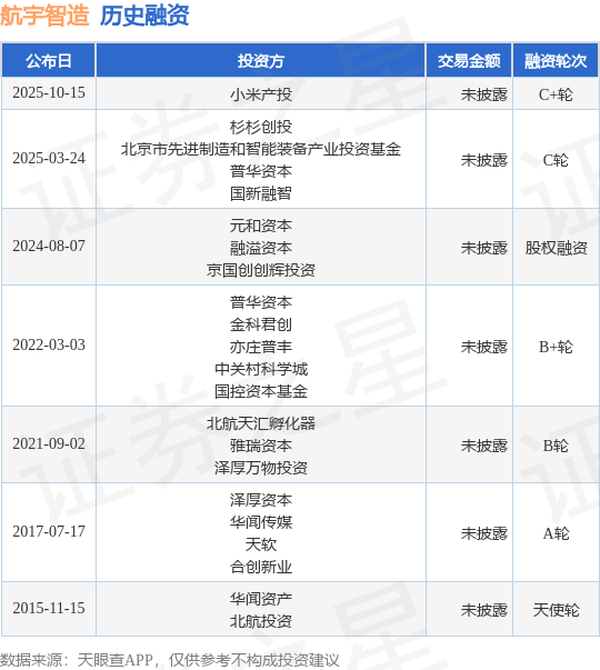 证券之星消息,根据天眼查APP于10月15日公布的信息整理,航宇智造(北京)工程技术有限公司C+轮融资,融资额未披露,参与投资的机构包括小米产投。