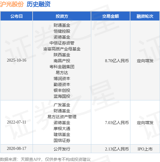 证券之星消息,根据天眼查APP于10月16日公布的信息整理,昆山沪光汽车电器股份有限公司定向增发融资,融资额8.70亿人民币,参与投资的机构包括财通基金,恒健控股,诺德基金,中信证券资管,渝富高质产业母基金,陕西基金,南昌产投,粤科金融集团,易方达,博润资本,勤道资本,银丰创投,蓝海国投。