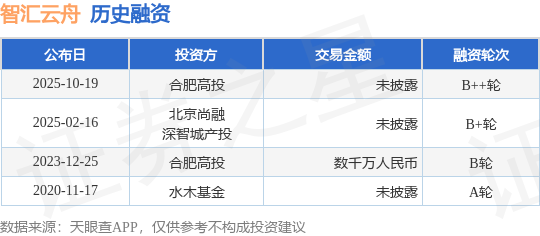 证券之星消息,根据天眼查APP于10月19日公布的信息整理,安徽智汇云舟科技有限公司B++轮融资,融资额未披露,参与投资的机构包括合肥高投。