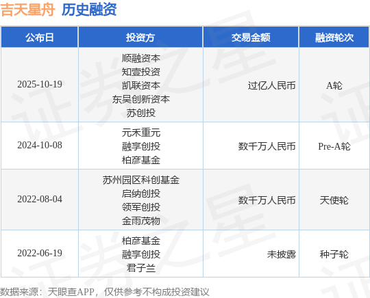 证券之星消息,根据天眼查APP于10月19日公布的信息整理,苏州吉天星舟空间技术有限公司A轮融资,融资额过亿人民币,参与投资的机构包括顺融资本,知壹投资,凯联资本,东吴创新资本,苏创投。