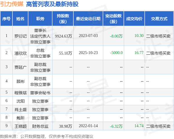 引力传媒近半年内的董监高及核心技术人员增减持详情如下: