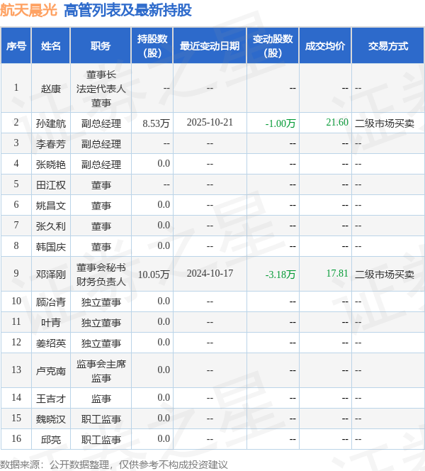 航天晨光近半年内的董监高及核心技术人员增减持详情如下: